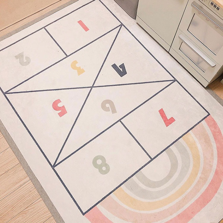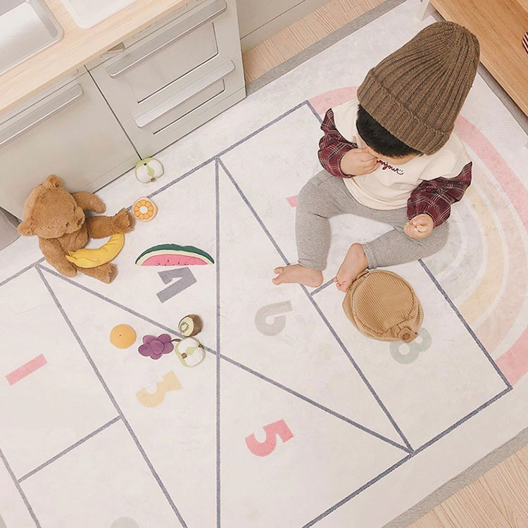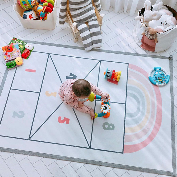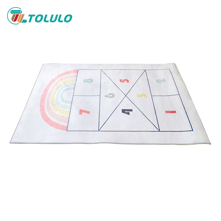 Klassisk hop count hopscotch børnetæppedesign. Børn kan lege med venner for at opbygge stærke sociale bånd og relationer. Dette børnetæppe vil ikke kun bidrage til en sjov tid, men også hjælpe børn med at lære tal med kreative billeder.